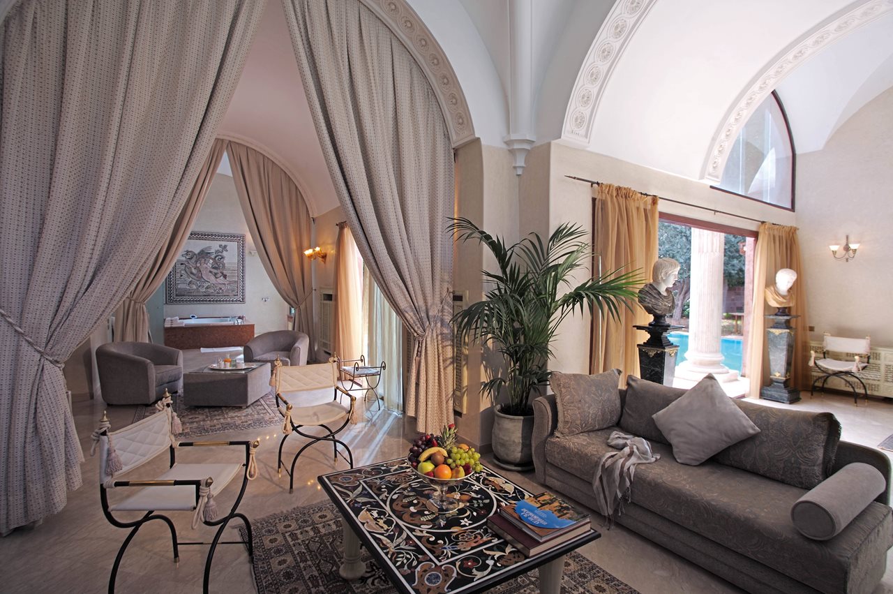 Романский стиль в интерьере хорошо смотрится в просторных помещениях. Он идеально подойдет для загородного дома с высокими потолками, виллы или большой квартиры. Данный стиль отличается массивностью, четкими формами и богатым декором с множеством объемных деталей. Для его воссоздания используются такие материалы, как керамическая плитка с имитацией натурального камня и мозаики. Детали обычно имеют правильные, геометрические формы. Часто в оформлении используют изображения мифологических существ или древнегреческих богов.
